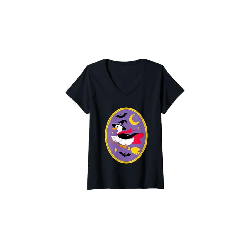 Womens Duck in Witch Hat On Broomstick Halloween V-Neck T-Shirt