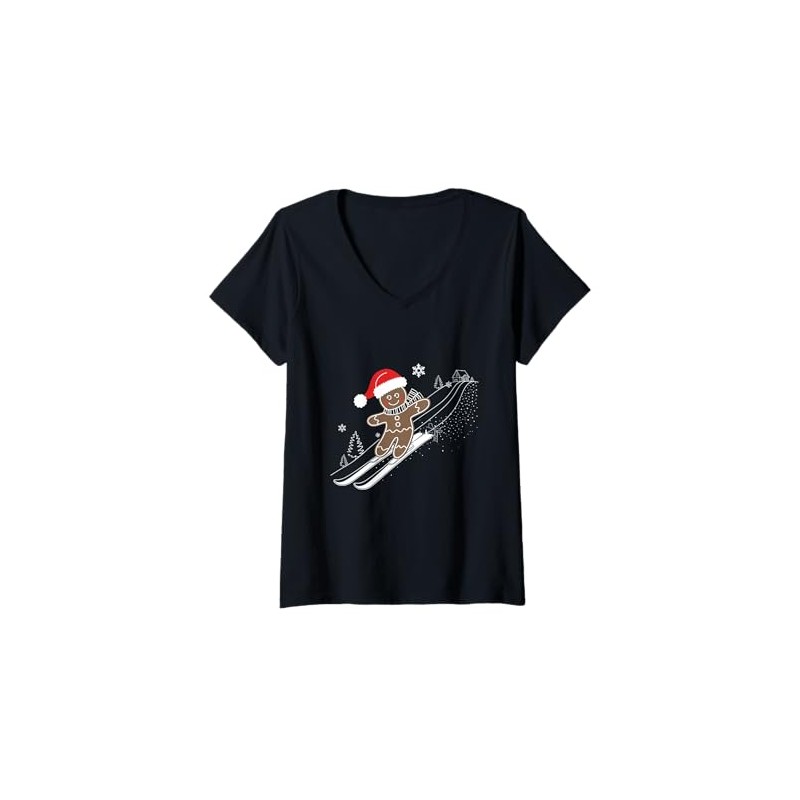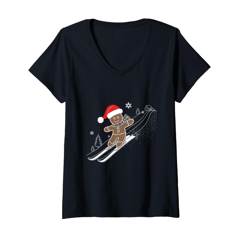 Womens Gingerbread Man Christmas Skiing Down Gifts Winter Xmas Kid V-Neck T-Shirt