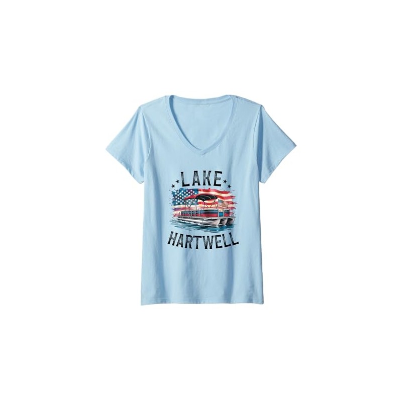 Womens Lake Hartwell American Flag Pontoon Boat V-Neck T-Shirt