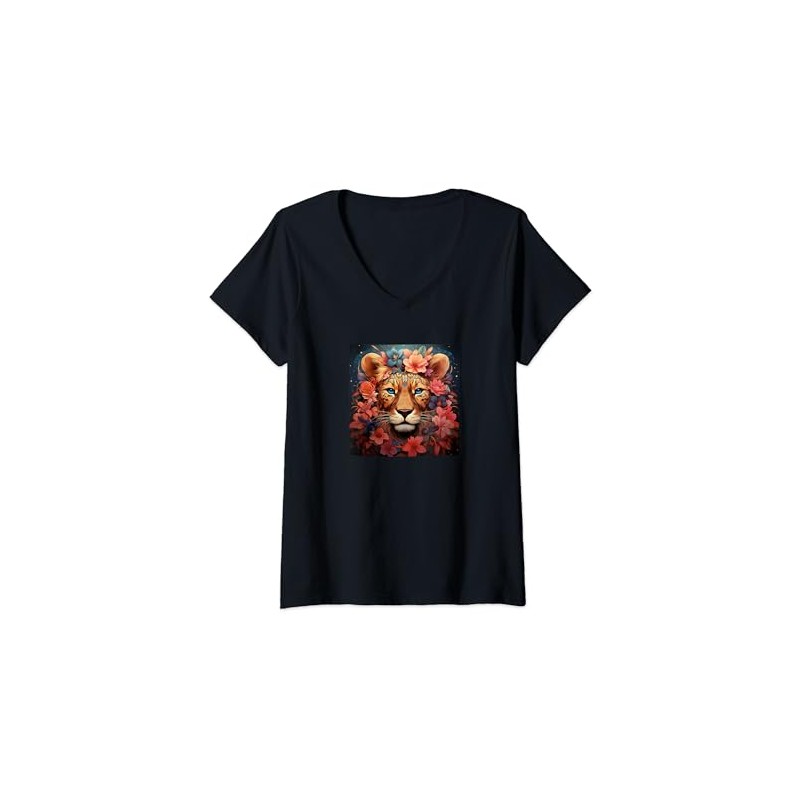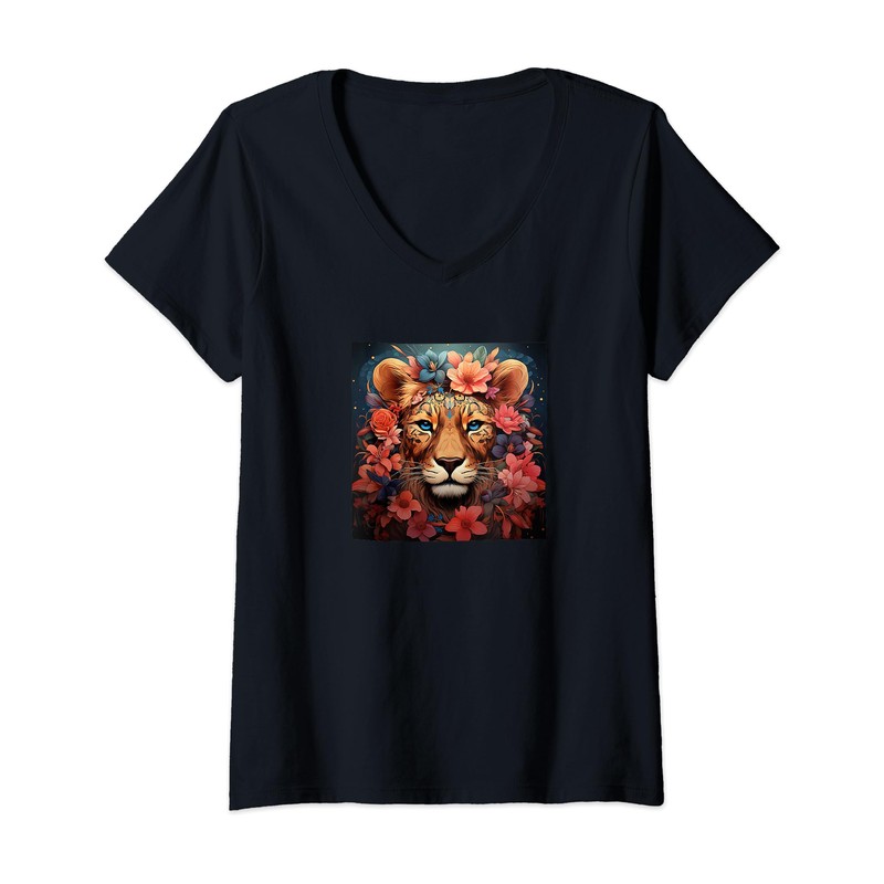 Womens Leopard With Flowers Around Boho Style Graphic V-Neck T-Shirt
