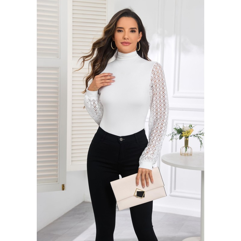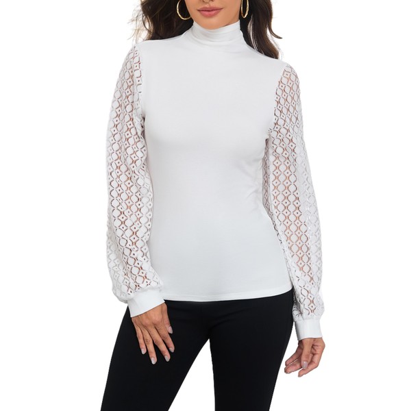 Womens Mock Turtleneck Lantern Puffy Eyelet Long Sleeve Fitted Layer Tee Shirts (L, White)