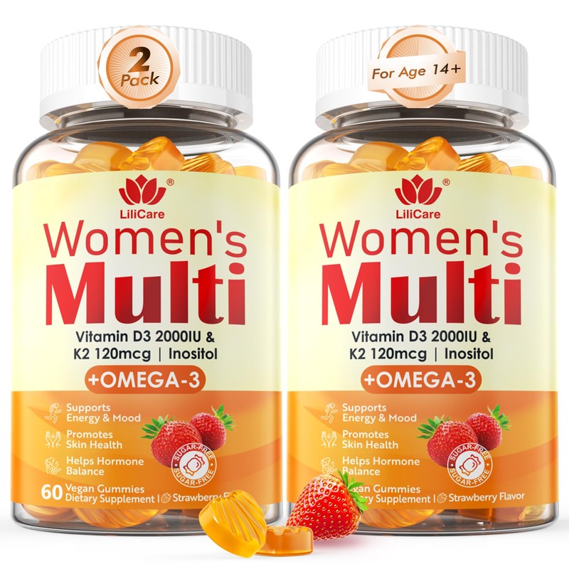 Womens Multivitamin Gummies, Sugar-Free Methylated Multivitamins w/D3 + K2, Vegan Omega 3, Algae Calcium, Daily Vitamin A C E B6 B12 Folate, Inositol, Minerals for Energy, Mood, Bone, Hormore, 120 Cts