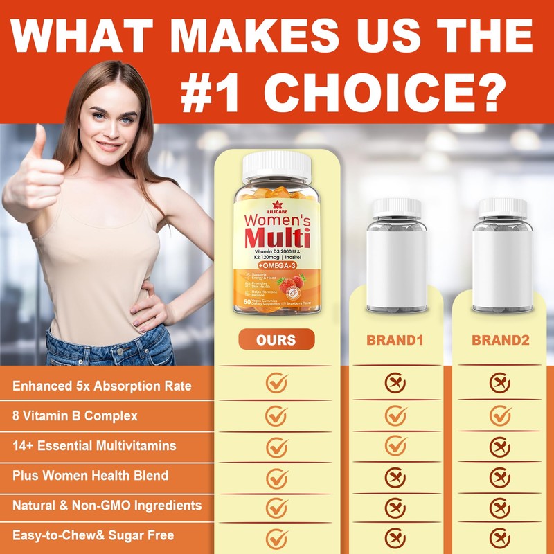Womens Multivitamin Gummy with Omega 3(DHA/EPA), Vitamin D3 K2, Calcium, Inositol, Daily Womens Vitamin A C E B Complex, L-MethylFolate, Methyl B12,Sugar Free Methylated Multivitamins Minerals, 60Cts