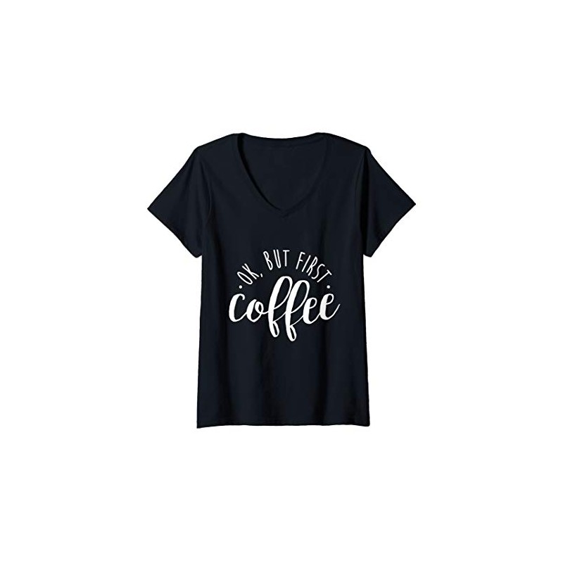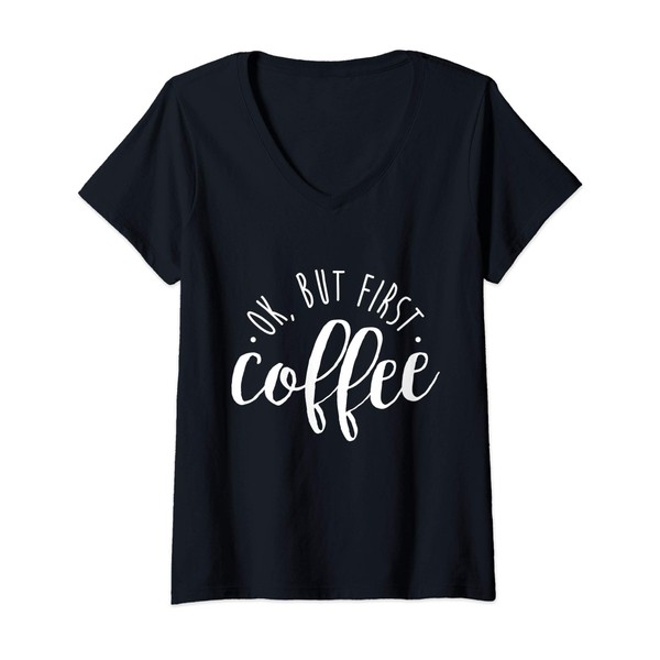 Womens Ok, But First Coffee Shirt Caffeine Drinker Addict Gift V-Neck T-Shirt