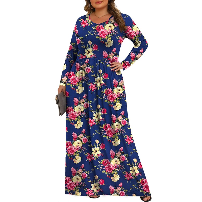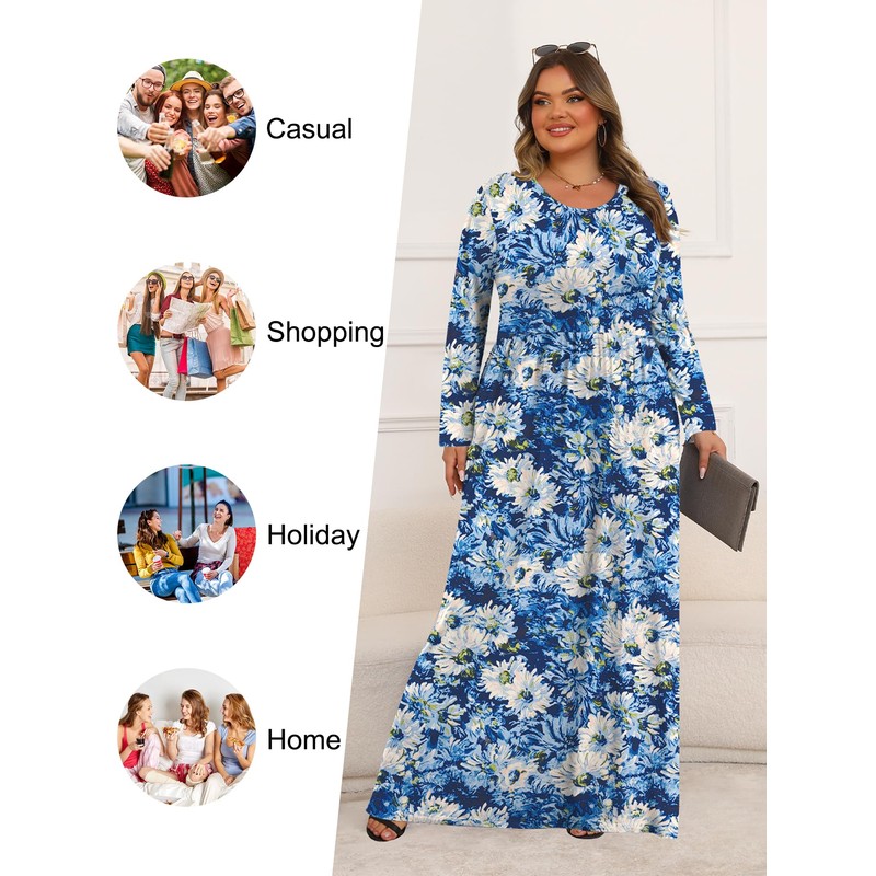 Womens Plus Size Maxi Dresses Long Sleeve with Pockets Casual Long Dress Blue Begonia 3X