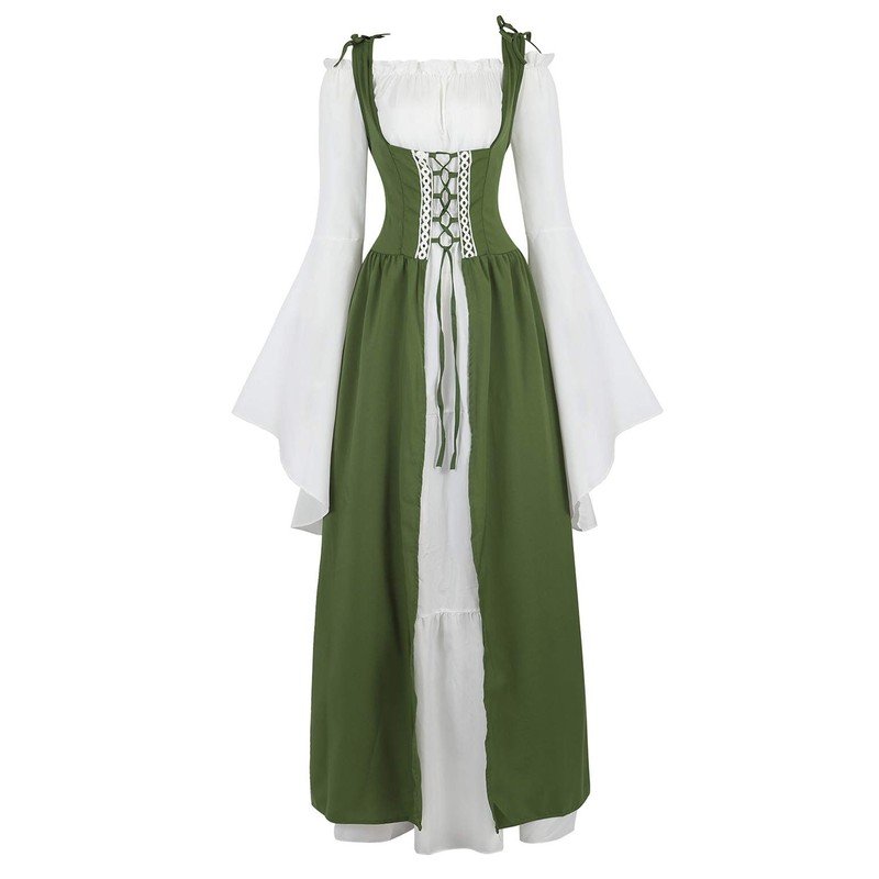 - Features: Irish over dress with lovely trim, front lace-up,adjustable shoulder ties and back laces, floor length. Adjustable lace design helps you to adjust your bust and waist easily, makes it suitable for your body perfectly,with elastic off shoulder, ruffle trumpet long sleeves, flared flounced large hem, full length,high waist, mythic chemise with 2 wide ruffles, elasticized neckline, sorceress sleeves,the great design that will make you the center of attention at any event!