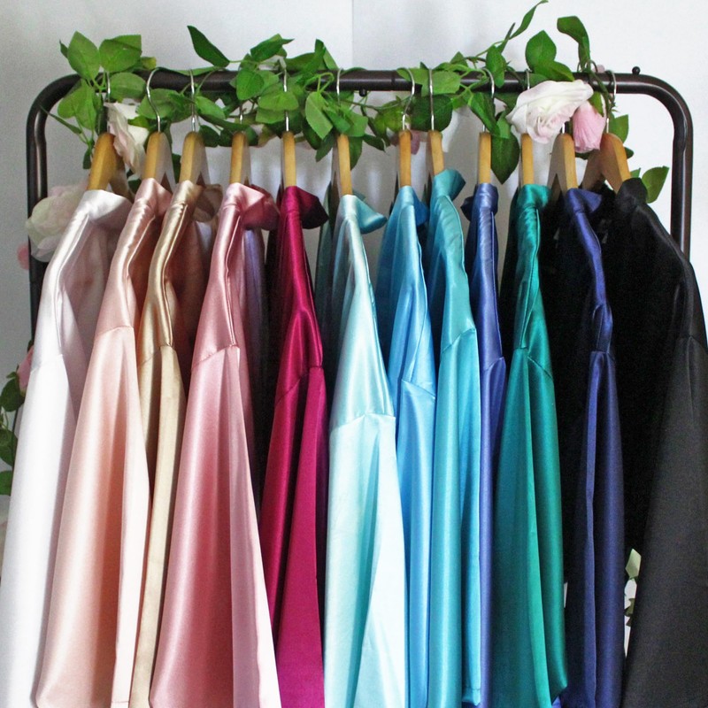 - These robes include two INSIDE tie strings for a more secure close, and a removal belt/sash with two belt loops. They are made of 100% polyester satin, giving it a smooth, soft, silky finish with a bit of sheen. They can be machine washed and tumble dry low.