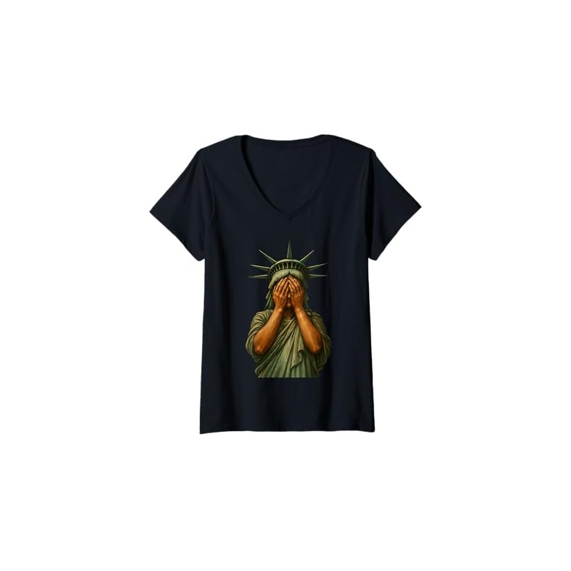 Womens Statue of Liberty Face covering in shame political Satire V-Neck T-Shirt