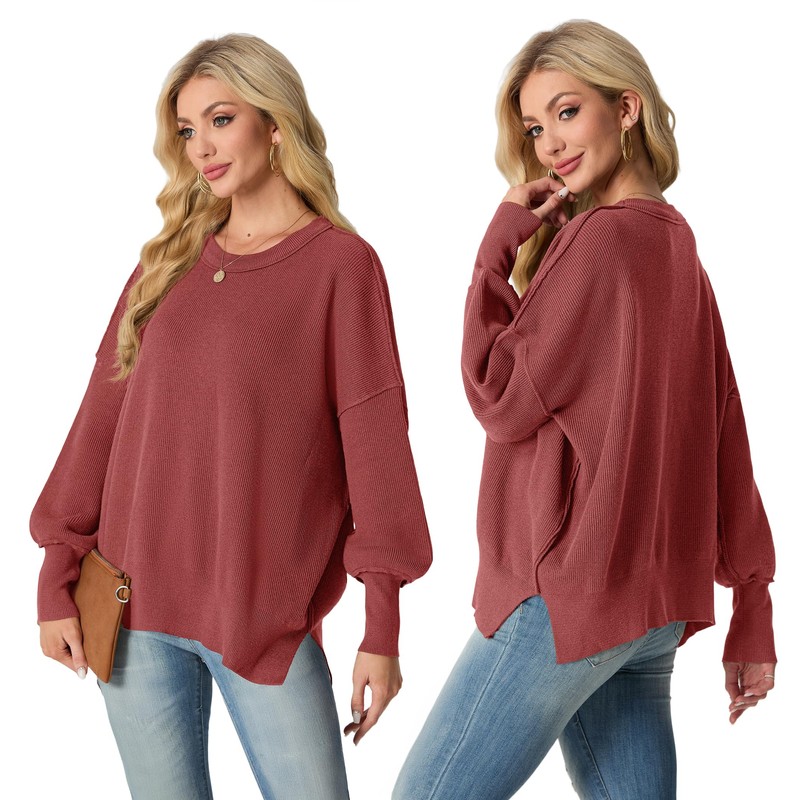 Womens Sweaters Fall 2025 Oversized Crewneck Batwing Long Sleeve Side Slit Ribbed Knit Cute Sweaters Pullover Tops Rust Red