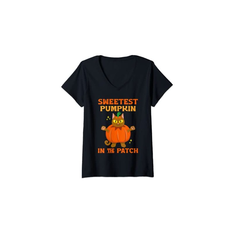 Womens Sweetest Pumpkin In The Patch Funny Cat Halloween V-Neck T-Shirt