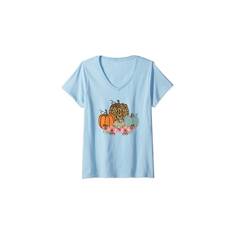 Womens Vintage Pumpkin Fall Leopard Print Rustic Boho Style Autumn V-Neck T-S...
