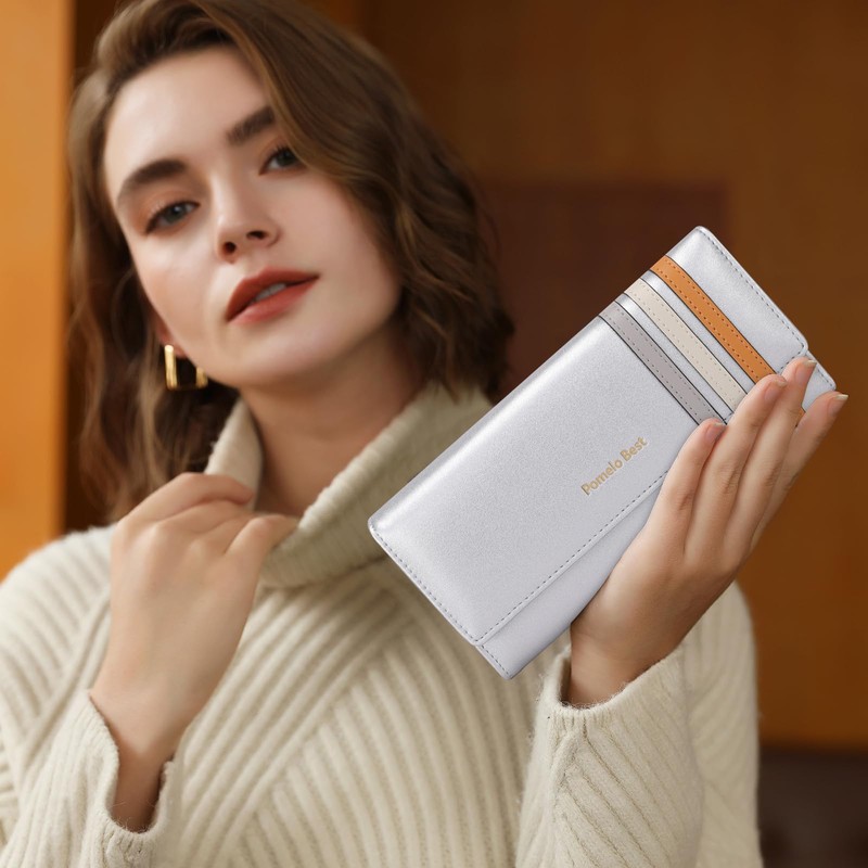 Womens Wallet, RFID Blocking Leather Wallet with Multiple Card Slots and Cellphone Compartment for Women, Silver