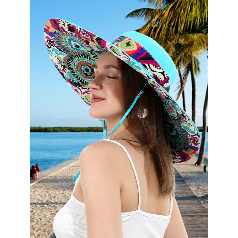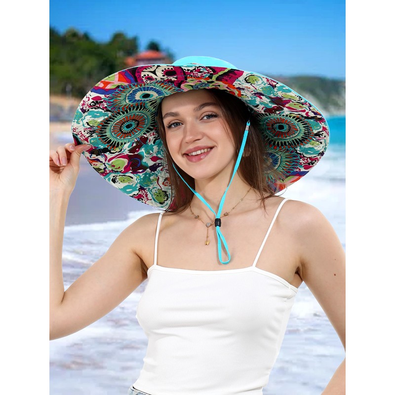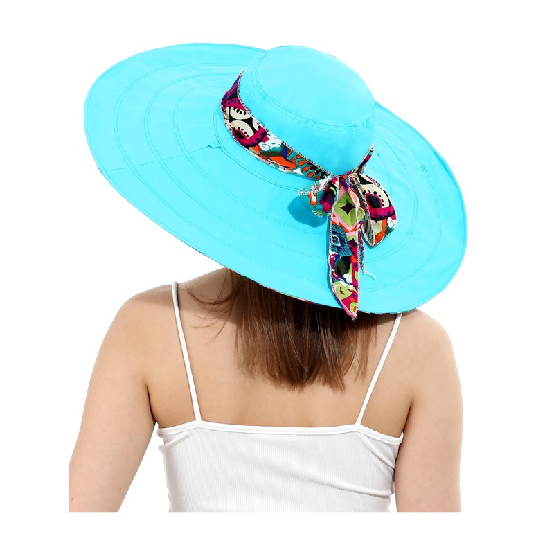 Womens Wide Brim Sun Hat Reversible Print UV Protection Oversized Beach Cap Travel UPF 50+ (L Blue)