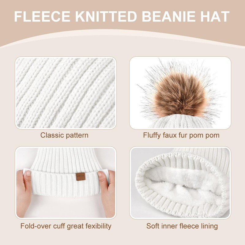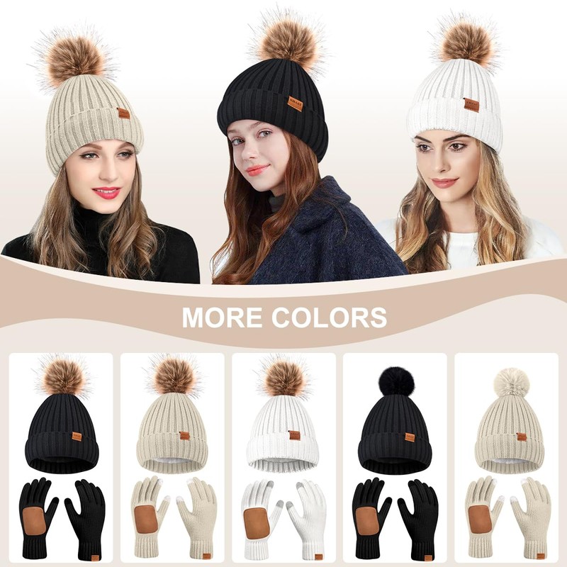 Womens Winter Beanie Hat Fleece Lined with Pom Pom,Warmer Faux Suede Touchscreen Gloves 2 in 1 Set for Cold Weather (US, Alpha, One Size, White Set 02)