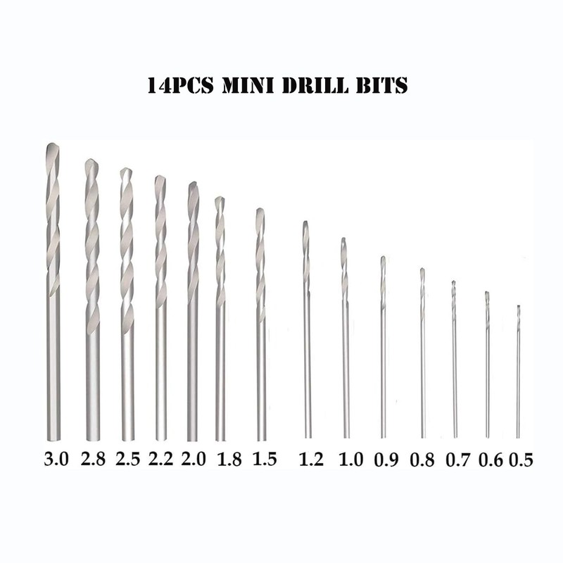 - 14 pieces mini steel drill bits for selection: contains 0.5 mm/0.6 mm/0.7 mm/0.8 mm/0.9 mm/1.0 mm/1.2 mm/1.5 mm/1.8 mm/2.0 mm/2.2 mm/2.5 mm/2.8 mm/3.0 mm drills, meet your different needs. Made of stainless steel, hard to bend or tear.