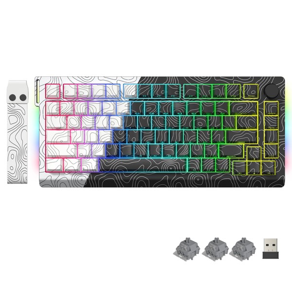 - Wireless 75% Keyboard with Strap: Q75 mechanical keyboard uses a fun design balanced in black and white, which perfectly integrates the topographic theme into the gaming keyboard. Carefully matched the Strap that matches the main picture of the keyboard. Popular and simple patterns, the lines are smooth, the patterns are clear and exquisite, and the compact 75% layout keyboard is perfect for intense gaming and comfortable typing.