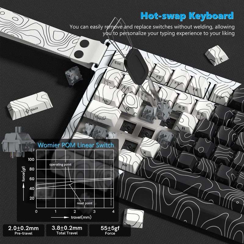 - Hot-swap Creamy Gaming Keyboard & Full POM Linear Switches: Wireless mechanical keyboard Hot swappable keyboard features a gasket mount structure that ensures vibration dampening and sound reduction, creating a comfortable and thocky typing. Compatible with both 3-pin and 5-pin switches. keyboard pre-installed custom womier full POM linear switches, perfect for gaming and typing. The 55 gf drive and 2.0mm pre-travel is sufficient for instant response, but sufficient to prevent accidental keystrokes. The 3.8mm total stroke provides a comfortable typing experience.