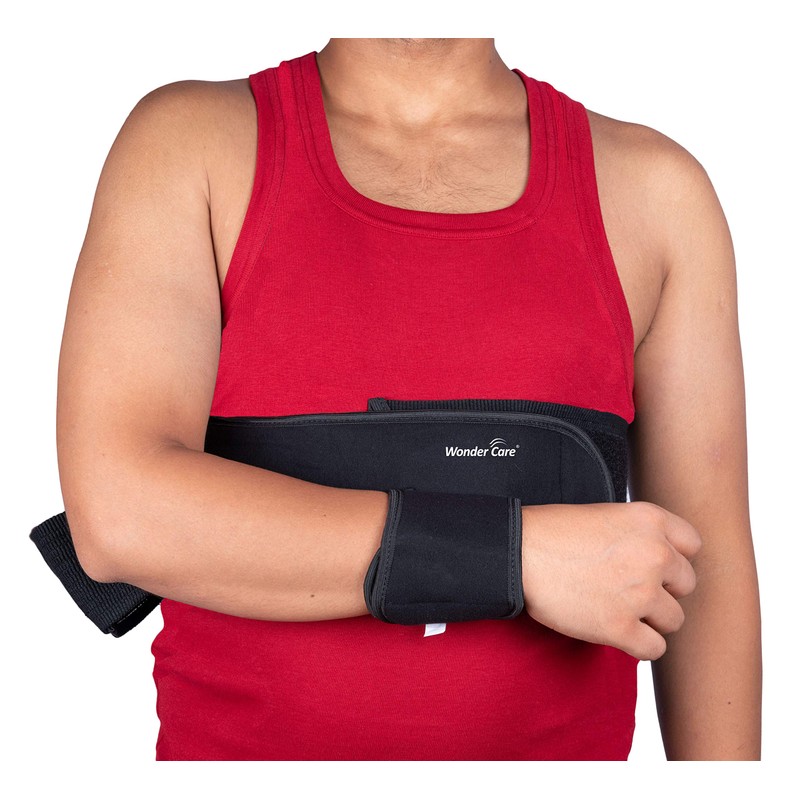 - Adjustable: fits left or right arm. Can be worn by the patient itself as it comes together at the front with a wide Velcro fastener. The patient of both men and women can adjust this shoulder compression bandage arm sling with the help of hook and loop adjustment.