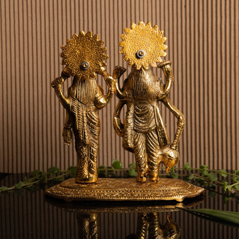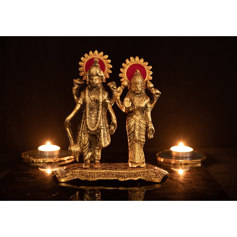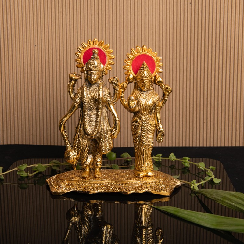 - MATERIAL: This Laxmi Narayan Idol is made of Aluminium with golden color electroplating.Exquisite craftsmanship and fine detailed work gives it a classic look.