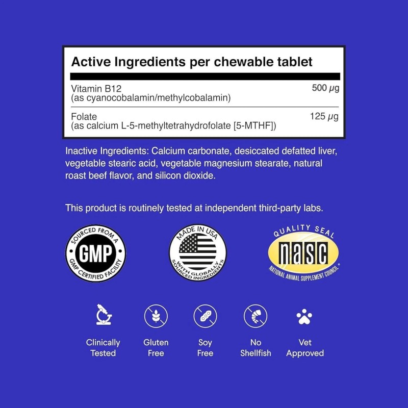 - Active Ingredients: Vitamin B12 for Dogs as Superior Methylcobalamin, Cobalamin & Folate (5-MTHF)