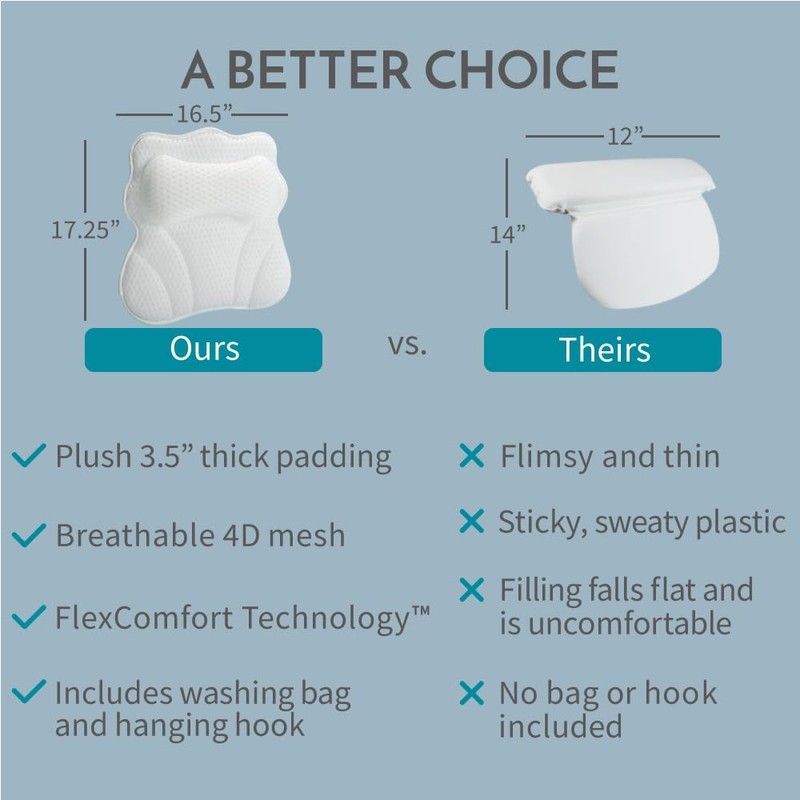 - THICK, INNOVATIVE DESIGN WITH FLEXCOMFORT TECHNOLOGY: extra thick and supportive bath pillow designed with our unique FlexComfort Technology; premium 3.5 inch thick padded filling contours to the shape of your body for maximum comfort