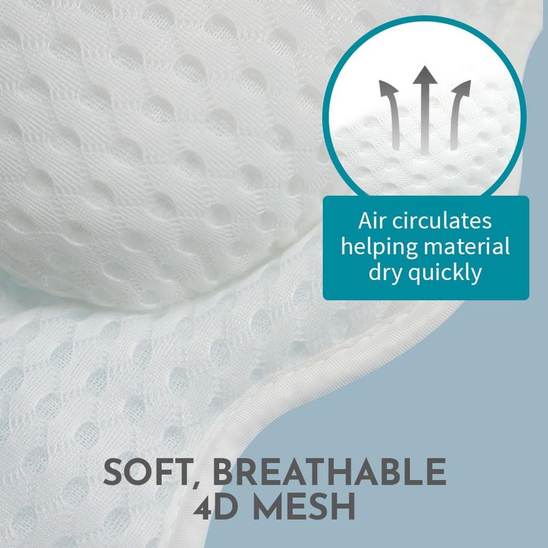 - SOFT, BREATHABLE AND QUICK DRY MESH: unlike plastic bath pillows, stay cool and comfortable while you bathe with our 4D breathable air mesh material; open weave mesh helps air to circulate and allows pillow to dry quickly; material is extremely soft, hypoallergenic and comfortable on skin