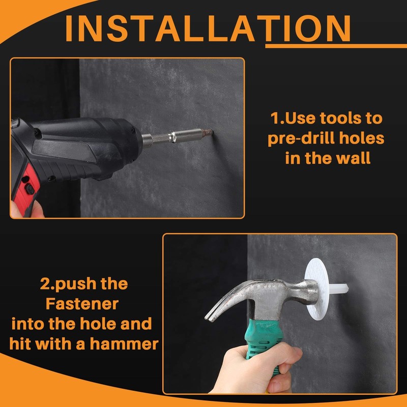 - Easy Installation Procedure: installation of our plastic masonry fastener is very straightforward and requires no pins, screws or adhesives; Start by drilling a hole in the base material, then insert the fastener into the pre drilled hole, and lastly, strike the fastener with a hammer until it levels with the insulation layer