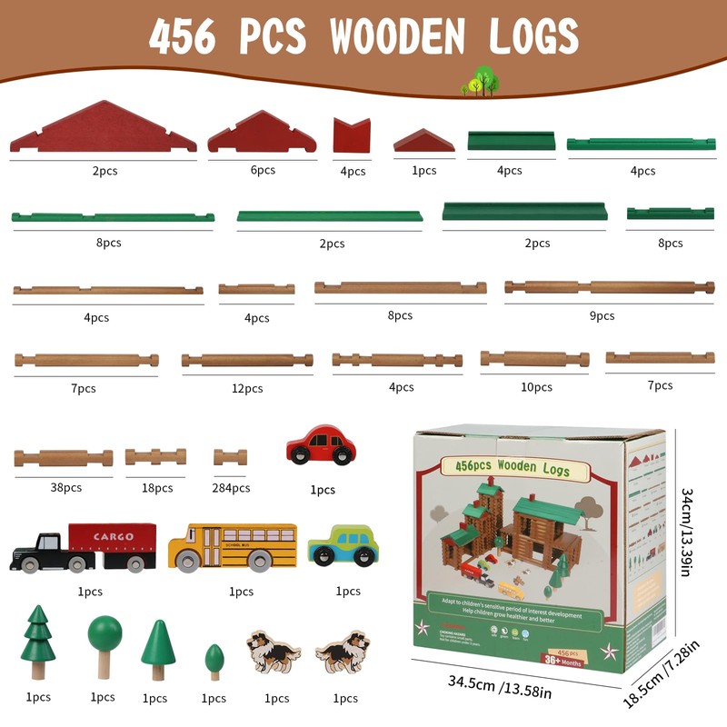 - 456PCS Wooden Log Big Villa: The wooden log cabin set contains 456 pieces made of real, high-quality wood. Each has indentations that can be used to connect it with others. Including car, plus trees, dogs, that add color and character to the building. Comes with a canvas storage bag for easy storage of various parts, keeping your room tidy
