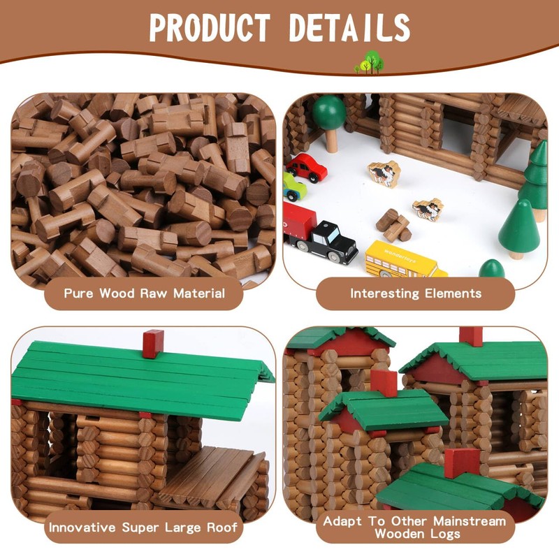 - Instructions Book Included: additional build ideas callout from instructions book, use the easy-to-follow, step-by-step building instructions to build the wooden logs set. Discover how the building system works, they’re strengthening hand-eye coordination, fine motor skills, problem-solving skills, spatial awareness and exercising their imagination. Age 3 years old and above can easily build other log cabins with their own imagination