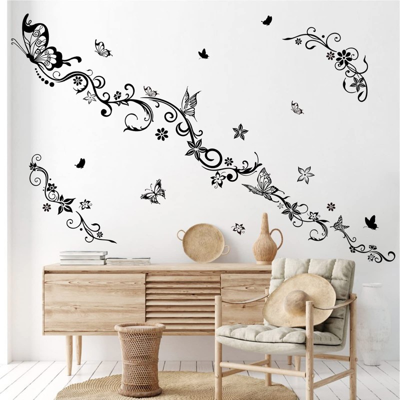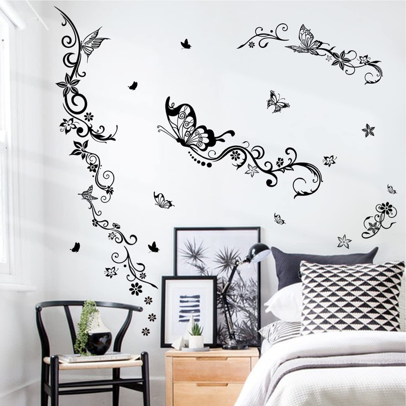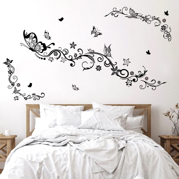 wondever Flowers Vine Wall Stickers Black Floral Butterfly Peel and Stick Wall Art Decals for Girls Bedroom Living Room TV Background