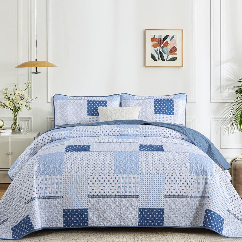 3 Piece blue patchwork plaid Quilt Set Quilt Set Inculde: 1 x queen quilt,2 x pillowcase Size Information: Queen-quilt 96” x 90”,pillowcase 20” x 28” King-quilt 106” x 90”,pillowcase 20” x 38” Exquisite Unique Pattern Design: This patchwork quilt A side adopts lattice design, and the B side is perfectly matched with the same color system, so that your room is full of fashion and elegance, adding a different color to your home. Easy to clean, machine wash in cold water and dry quickly.