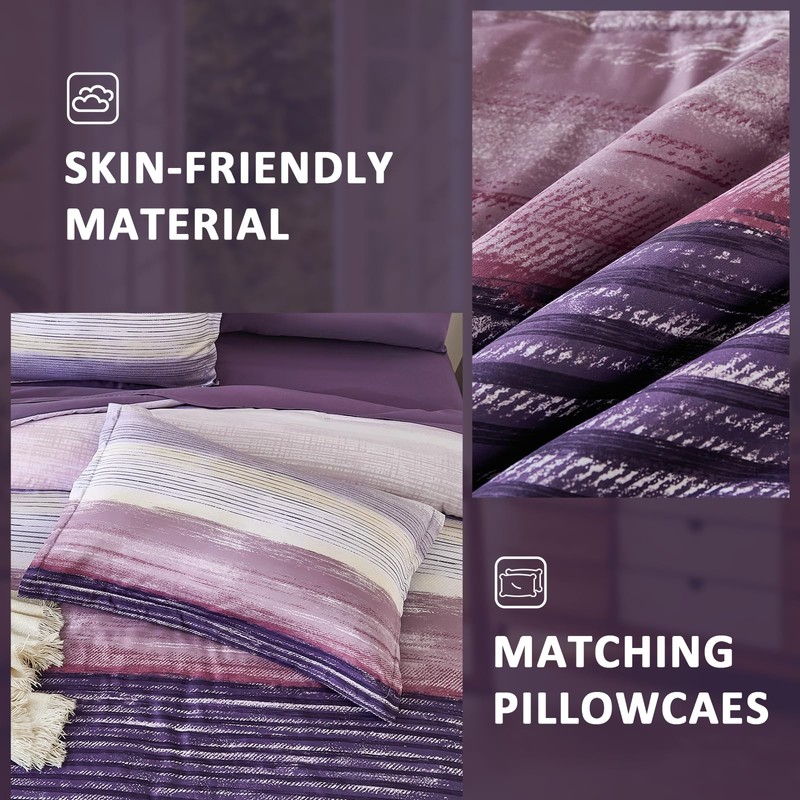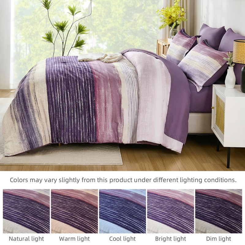 WONGS BEDDING 7 Piece King Comforter Set, Purple Striped King Size Bedding Set for All Season, Boho Soft and Breathable Bed in a Bag with Comforter, Flat Sheet, Fitted Sheet, Pillowcases & Shams