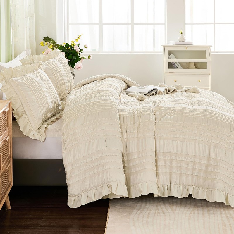 • [Seersucker Ruffle Design]:King vintage textured boho comforter featuring a unique seersucker texture with tufted ruffle design.While ensuring a comfortable sleep, add a stylish and simple atmosphere to the bedroom.