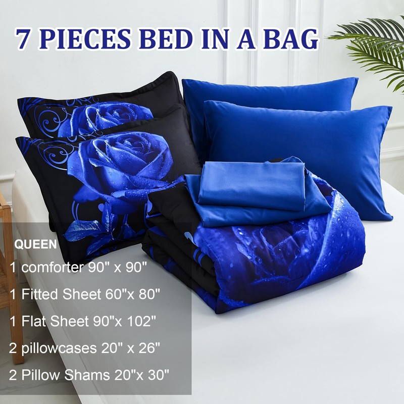 • [7 Pieces Bed in a Bag] Blue rose bed in a bag queen with 1 comforter 90" x 90" + 2 pillowcases 20" x 26"+1 Fitted Sheet 60"x 80"x14"+1 Flat Sheet 90"x 102"+2 Pillow Shams 20"x 30".The fitted sheet is 14 inches Pocket, fits mattresses up to 14".