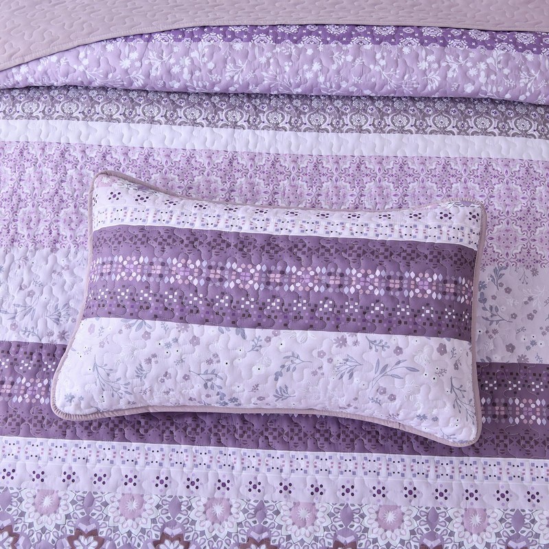 3 Piece Purple Bohemian Striped Floral Quilt Set