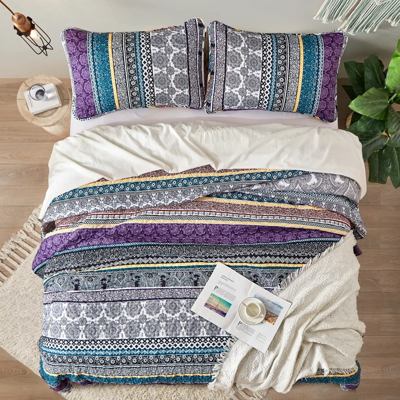 WONGS BEDDING Boho Quilt Set Queen Size, Purple Bohemian 3 Pieces Quilt Sets, Lightweight Summer Bedspread Coverlet Bedding Set for All Season (96"x90")