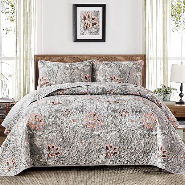WONGS BEDDING Floral Quilt Set Queen Size, Grey Botanical Queen Bedspread Bedding Sets Soft Lightweight Microfiber Flower Gray Coverlet Set 3 Pieces for All Season (96"x90")