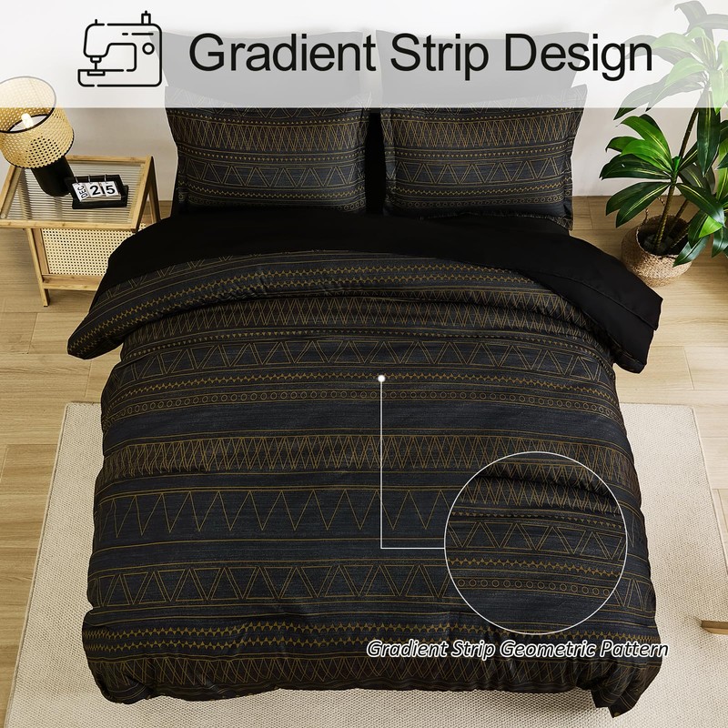 - [Ultra Soft Microfiber Material] This black gold boho stripe comforter set uses super soft microfiber material, filling the comforter with whole piece of microfiber. Frim stitching with exquisite hemming, the microfiber solid comforter is highly durablility, high tensile strength, wrinkle-resistant, fade-resistant and machine washable. King sized comforter bedding set, moderate thickness, suitable for all seasons.