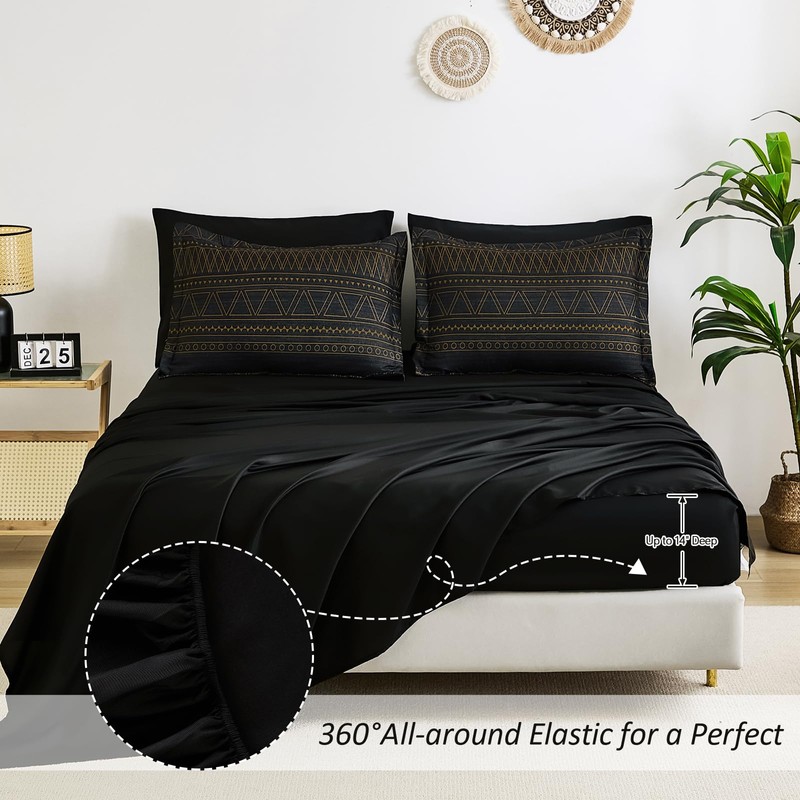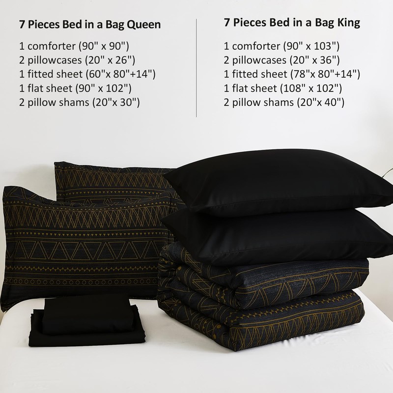 - [7 Pieces Bed in a Bag] This black gold boho king bed comforter set include 7 pieces. 1 comforter 90" x 103" + 2 pillowcases 36" x 20"+1 Fitted Sheet 78"x 80"x14"+1 Flat Sheet 102"x 108"+2 Pillow Shams 20"x 40". NOTE: No Pillow Insert Includes.