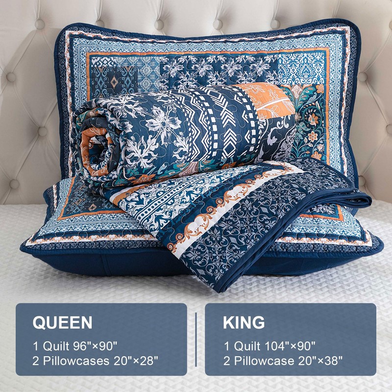 - 【Quilt Set Queen Size】Navy blue quilt set king include 1 quilt (104"x 90") + 2 pillowcases (20"x 38").Lightweight Bohemian bedspreadcan change with the seasons. Match it from summer to winter, from living room to bedroom.Give you the most intimate care and bring the most stylish home experience!