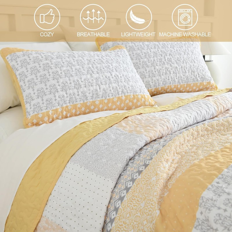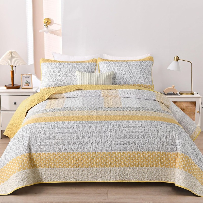 - PERFECT PATTERN DESIGN: This bohemian stripe reversible quilt sets twin in classic color designed with yellow and grey makes your room bright and cozy. The unique stripe design is combined with bohemian patterns, make your bedroom look simple and elegant.