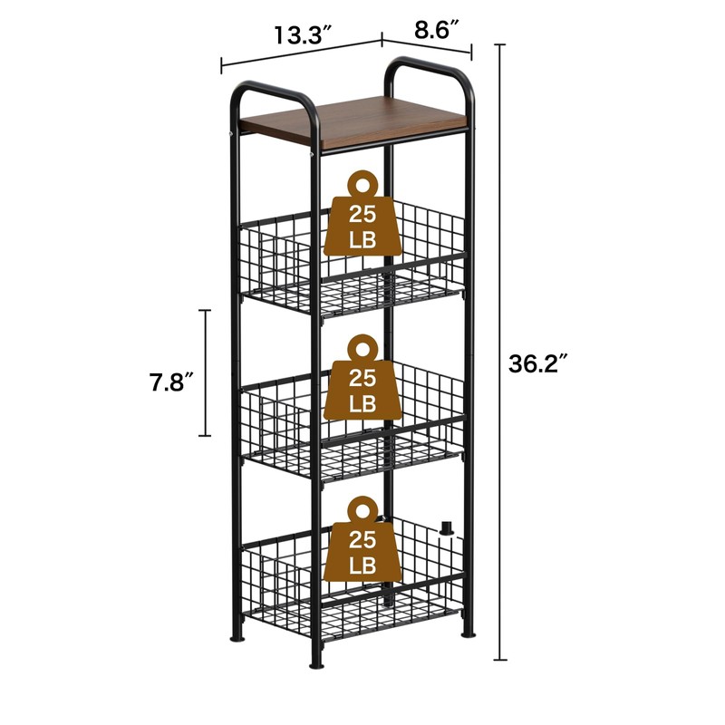 wonline 4 Tier Slim Metal Storage Cart with Walnut Wood Top Kitchen Organizer Shelf Fruit Basket Stand for Small Spaces Office Bathroom Laundry Room