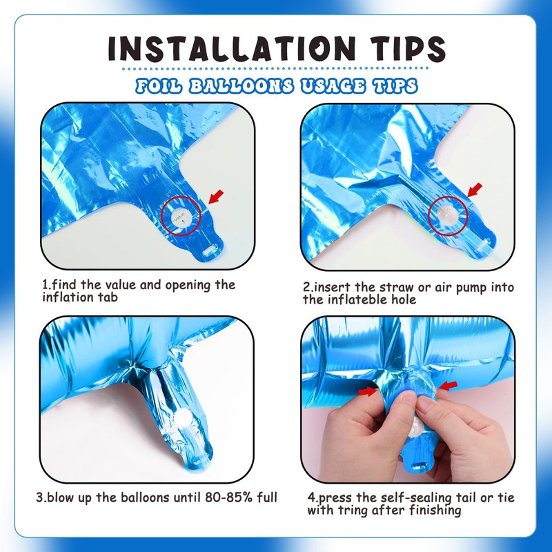 - Easy to use:Find the value and opening the inflation tab. Insert the straw or air pump into the inflatable hole. Blow up the balloon until 80-85 percent full. Press the self-sealing tail or tie with string after finishing