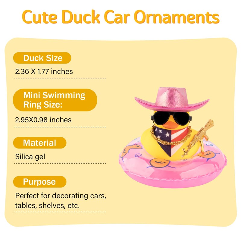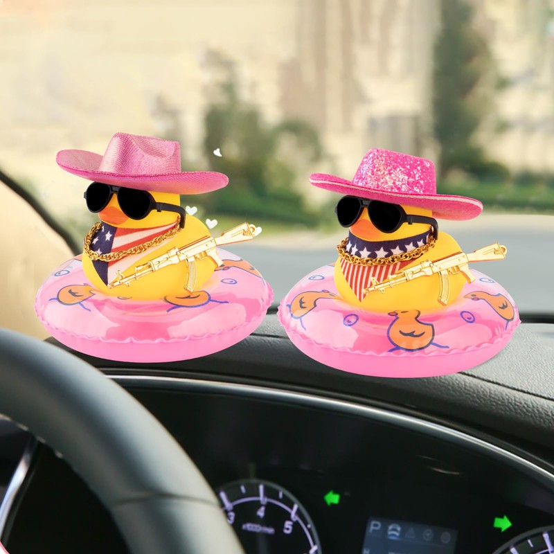 - Funny Duck Car Decorations: These car ducks for the dashboard are equipped with a space cowboy hat, swim ring, scarf, sunglasses, gangster tool, and double-sided tape. They are unique and adorable ducks designed to decorate the interior or exterior of your car. Whether you choose rubber ducks for your car to place on your dashboard decorations or in other areas of your car, these cute duck accessories are sure to bring a smile to your face as you cruise down the road.