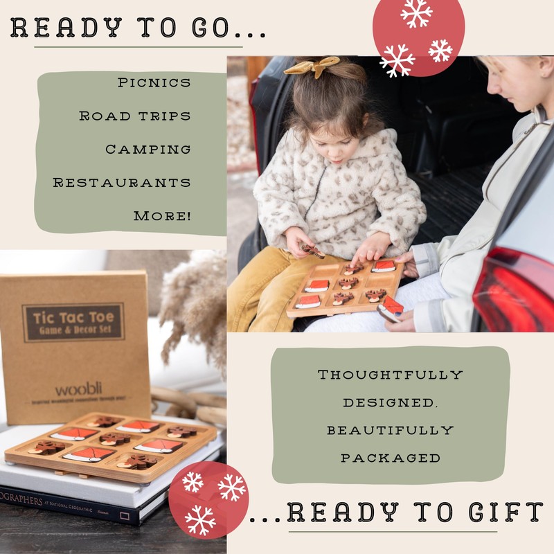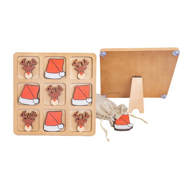 Woobli Christmas Wooden Tic Tac Toe Game & Decor Set - Handcrafted Rustic Board Game for Home, Nursery, and Travel, 8 5/8” x 8 5/8” Board Game, 5 Santa Hats and 5 Reindeers with Mini Burlap Bag