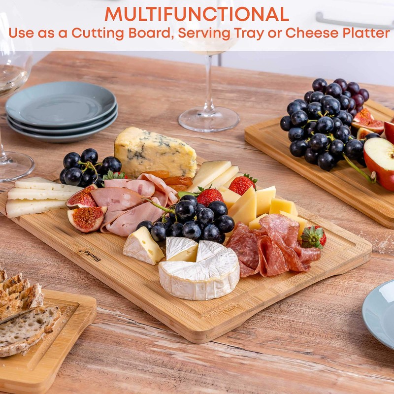 - Use this 15x10 inch wood cutting board on both sides to cut any food (fruits, vegetables, meat, bread), or as a serving board for cheese, crackers, appetizers, or barbecue. This bamboo cutting board can be used as a serving tray, cheese platter or charcuterie board