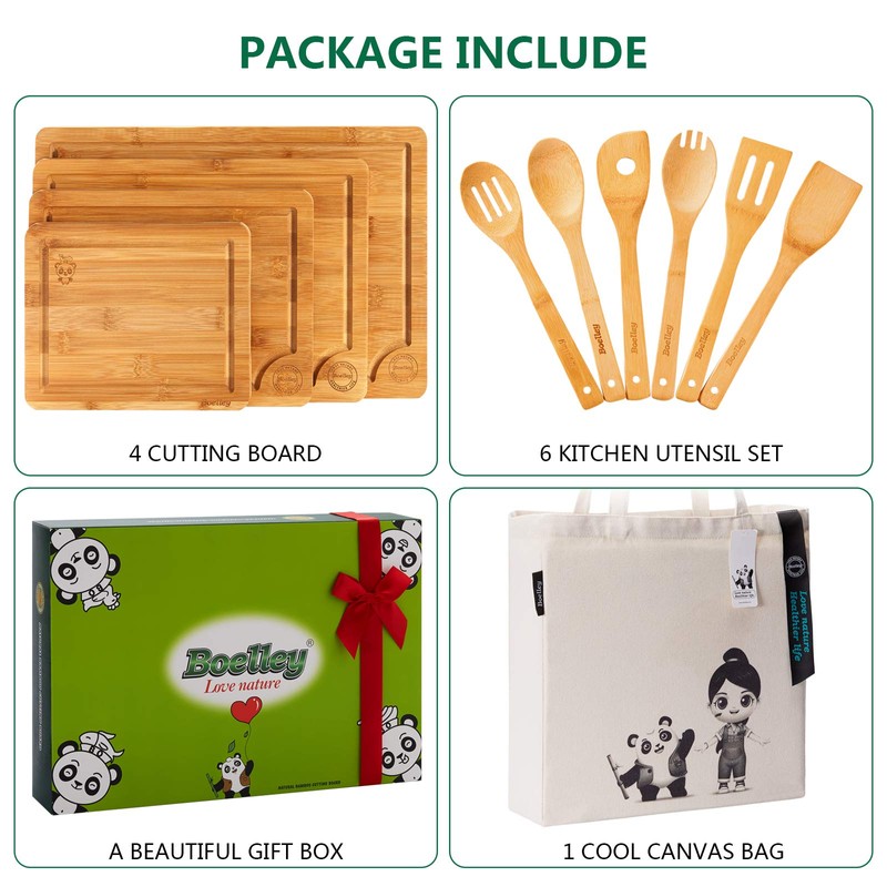 - ✅ WHAT YOU GET: These wood cutting boards for kitchen include everything you need for an enhanced cooking experience, with 4 different sized bamboo boards (extra-large, large, medium, small), 6pcs kitchen utensils set plus a unique canvas bag for shopping, with giftable box, easy storage and everyday use!