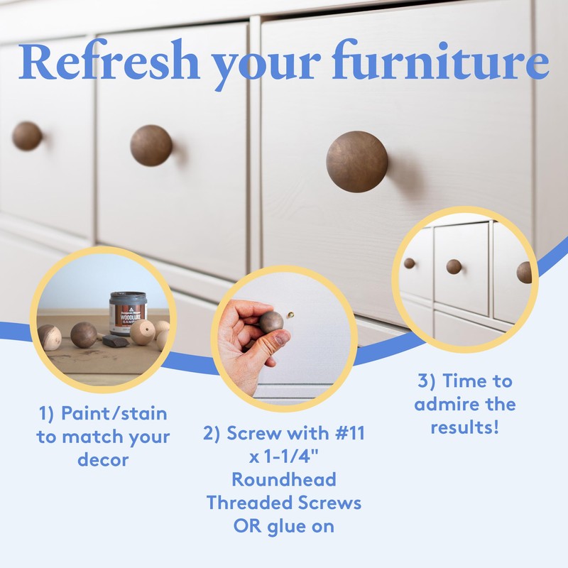 - MUST HAVE FOR DIY FURNITURE BUILDING - Whether you need a kitchen cabinet handle, wooden knobs for a dresser, or drawer pulls, these wooden knobs will do the trick! The classic round shape goes with anything from kitchen cabinets to bedroom dressers. The knobs can also be cabinet feet or dresser feet - ball feet won't scratch your floor or snag your carpet. Designing a closet? Use these as modern wooden wall hooks. Attach easily using a threaded screw or even wood glue. (screw not provided)