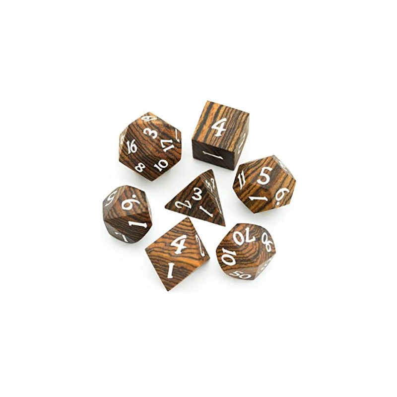 - Wood Polyhedral Dice Set. The set includes 7 pieces: D4, D6, D8, D10, D100, D12, and D20. These polyhedral dice are made out of wood.