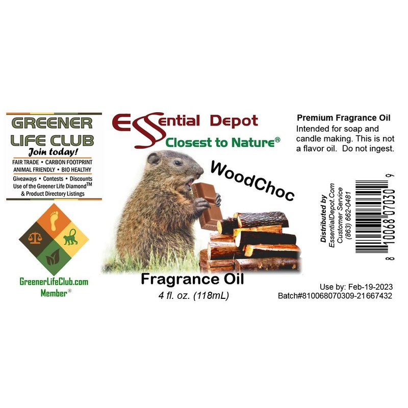 - WOODCHOC FRAGRANCE OIL, VOLUME: 4 fl. oz., COUNTRY OF ORIGIN: USA, COLOR: Light to dark amber, CONSISTENCY: Thin.